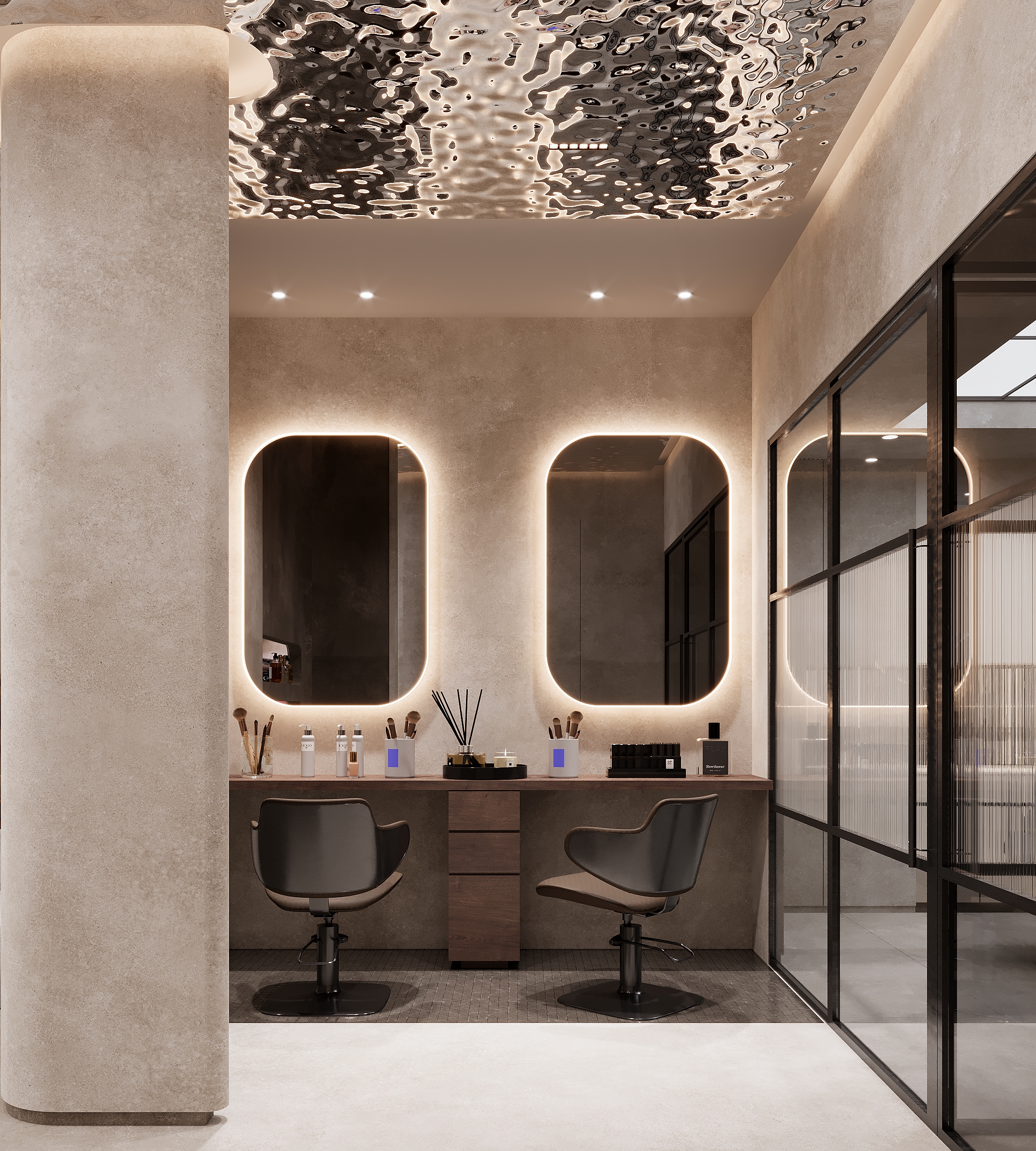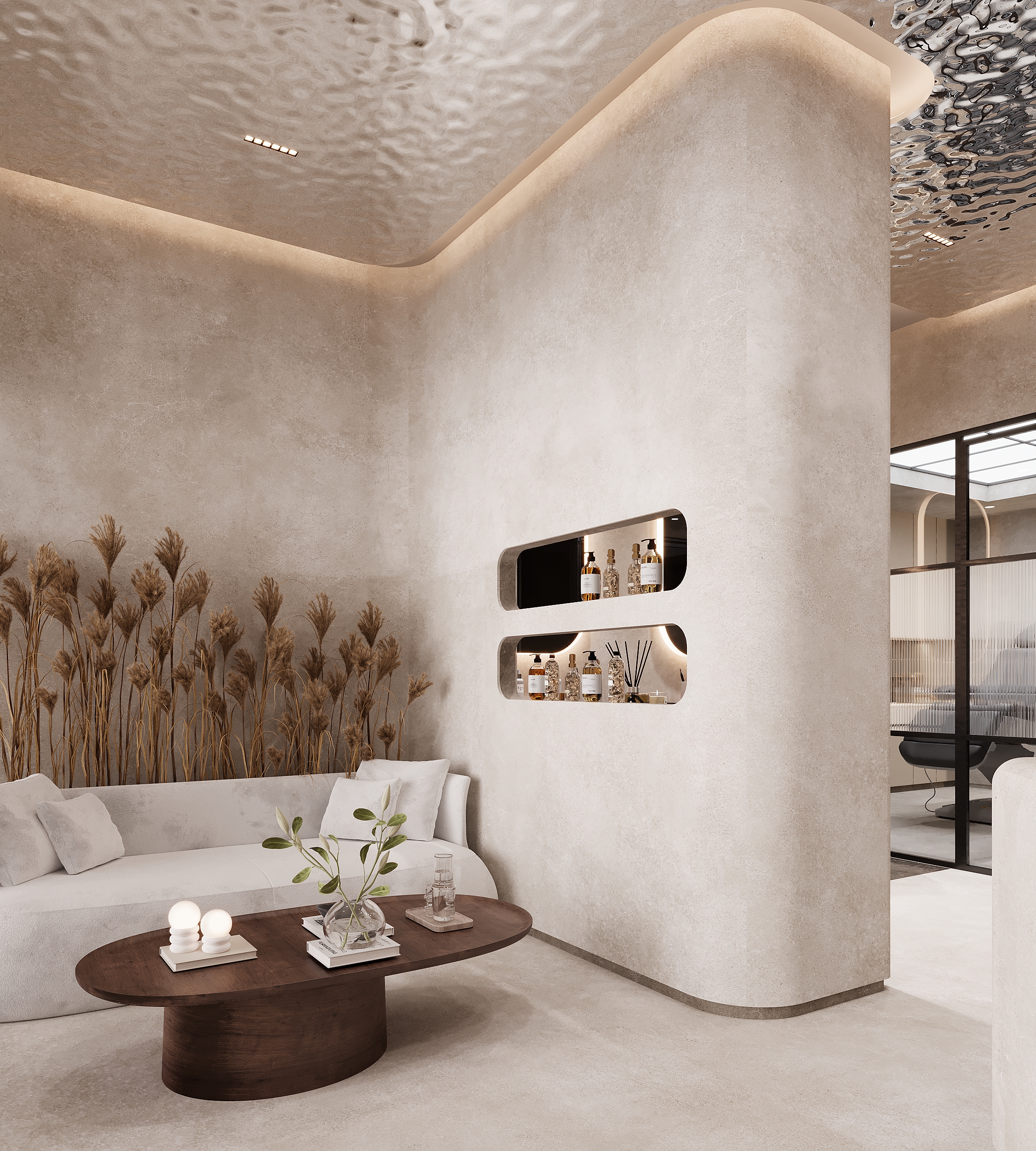 Sculpted as a sanctuary for self-expression, RiStudio merges modern sensibilities with spatial fluidity. Soft curves and seamless transitions create a sense of calm continuity, echoing the organic nature of the human form. A rippled metallic ceiling reflects dappled light across warm-toned surfaces, animating the space with quiet dynamism. Earthy textures, minimal ornamentation, and recessed display niches evoke understated luxury. The interplay of sculpted seating, indirect lighting, and curated accessories fosters a serene yet sophisticated ambiance. Open sightlines and tonal cohesion expand the spatial perception, making RiStudio feel both intimate and infinite; a refined canvas for transformation and care