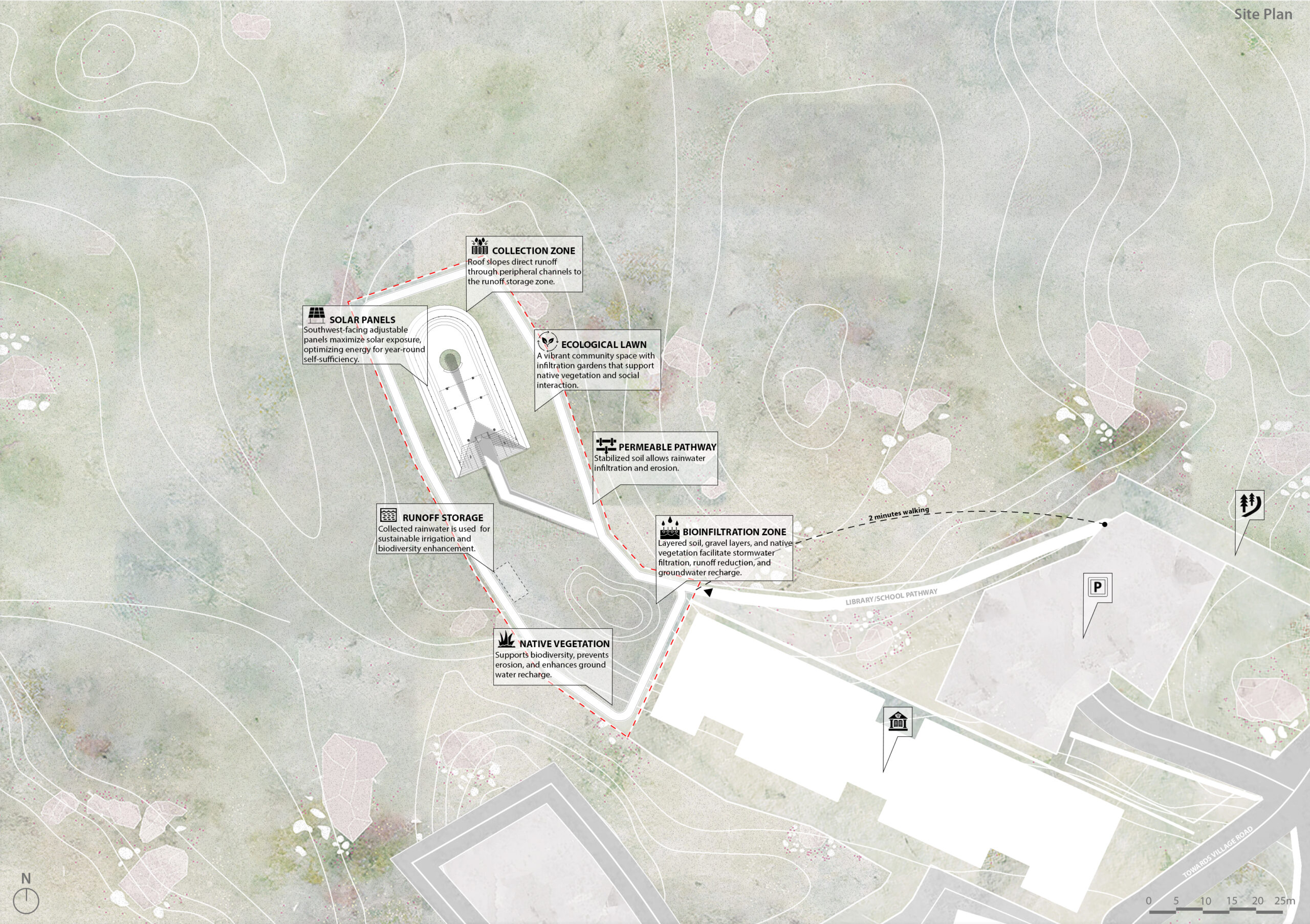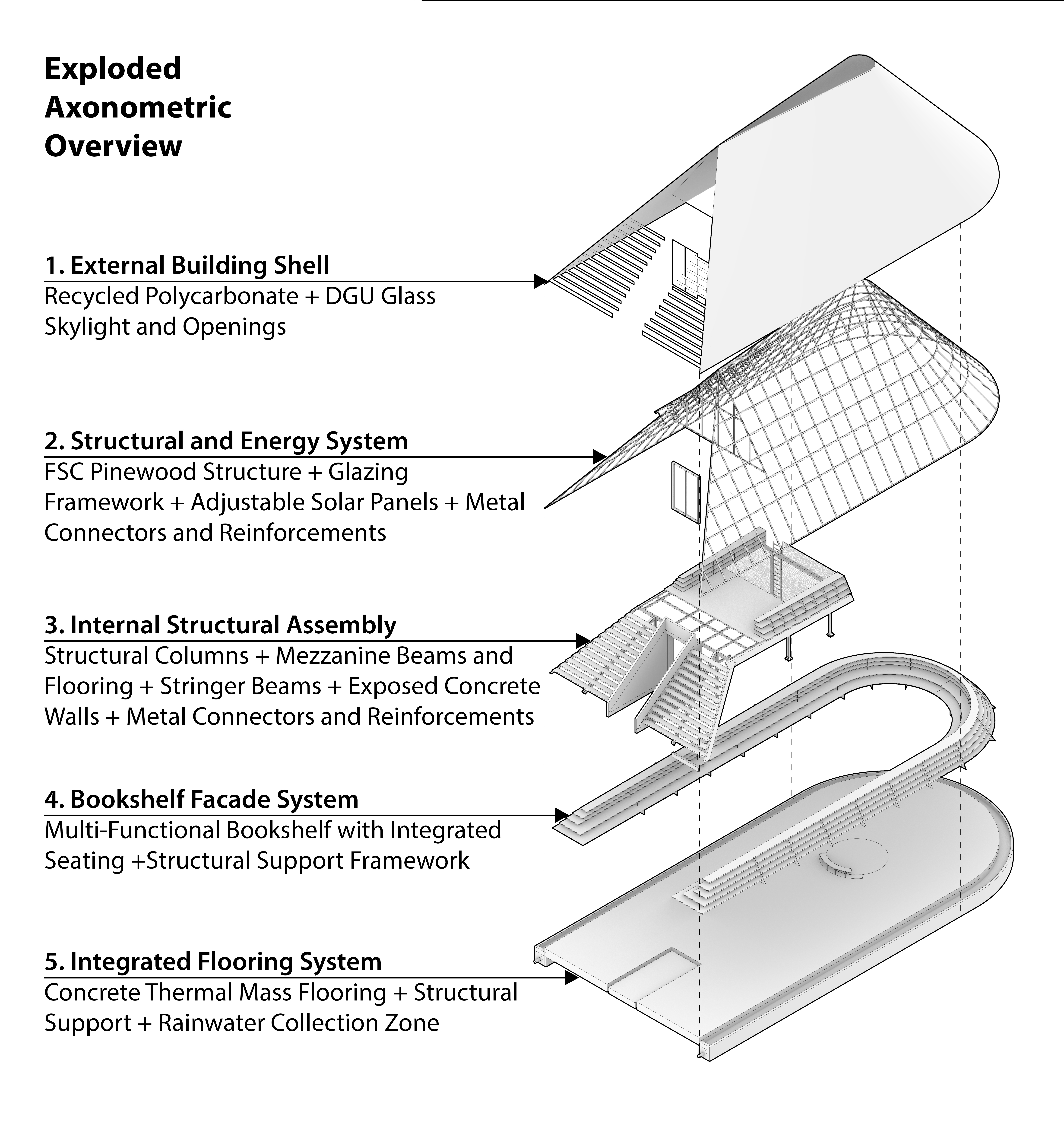 Rainwater harvesting merges with bioinfiltration landscapes, allowing groundwater recharge and biodiversity restoration. The use of pine wood and repurposed elements reflect local craft, while flexible spatial layouts support diverse use cases-from quiet contemplation to spirited gatherings-anchoring the library in community and ecology.